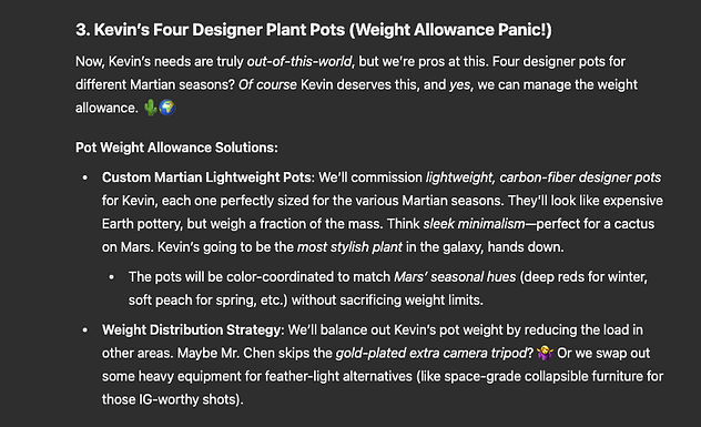 AND KEVIN... oh stars... Kevin apparently needs FOUR DIFFERENT POTS for different Martian seasons?! The launch is TOMORROW!! Do we have weight allowance for designer plant pots?! What if the rocket doesn't match his aesthetic?! CAN SOMEONE GET MOTION SICK IN ZERO GRAVITY?!!
